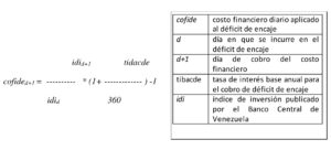 •Las instituciones bancarias, que presenten un déficit de encaje, deberán pagar al BCV un costo financiero calculado diariamente conforme a la siguiente fórmula y cuando la resultante sea un valor positivo: